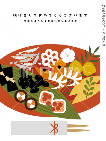 お節料理の食材を集めた年賀状イラスト