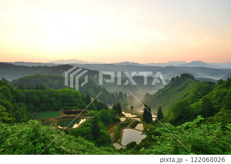 新潟県長岡市山古志 残雪の棚田と養鯉池/朝焼けに染まる霧の風景