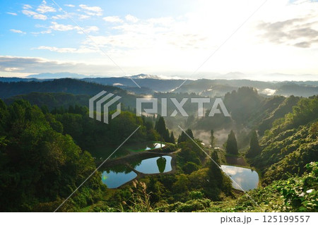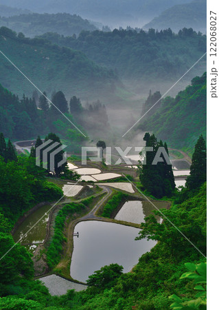 新潟県長岡市山古志 霧の湧く、棚田と養鯉池の里山