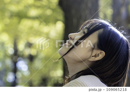 紅葉を楽しむ若い女性