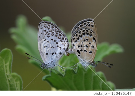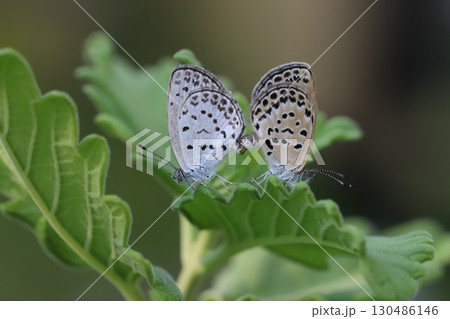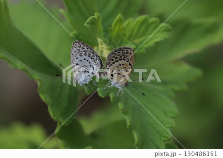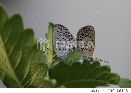 青葉の上、木陰で交尾中のヤマトシジミ蝶。マクロ接写写真(マクロレンズ使用・屋外自然光・接写写真)