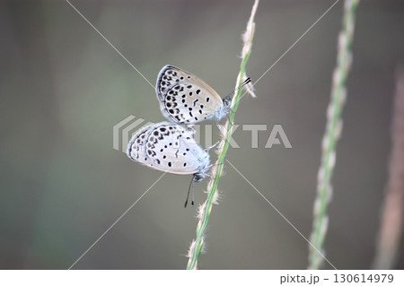夏の野原で草の葉に止まるヤマトシジミ蝶の雄と雌