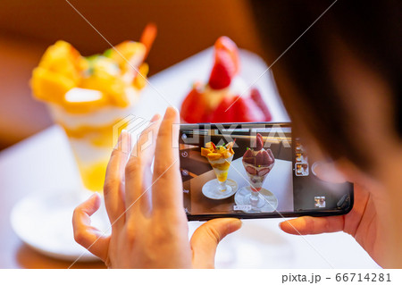 カフェでパフェの写真を撮る女性