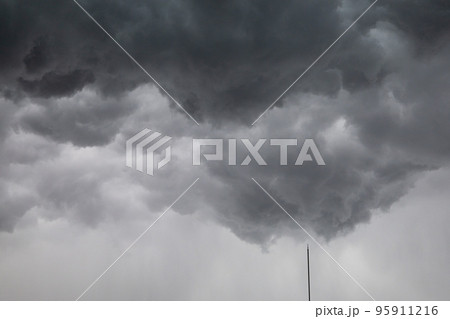 都会の秋の空・竜巻が発生しそうな嵐の雨雲が広がる空と避雷針(東京都千代田区)