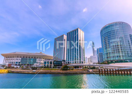 日本の横浜都市景観 みなとみらいのKアリーナなどを望む=23日