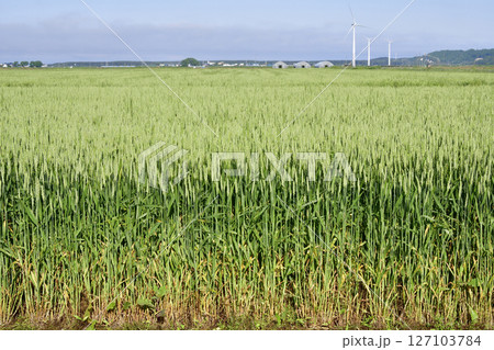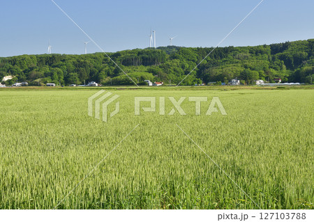 初夏の北海道江差町で青い秋まき小麦畑の風景を撮影