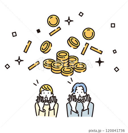 シンプル イラスト 舞い踊るコインに狂喜乱舞する若い男性と女性
