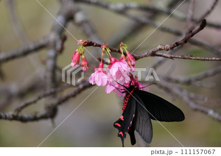 ヒカンザクラの蜜を吸うアゲハ蝶 Ageha sucking cherry honey