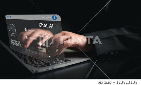 ChatGPT Chat with AI or Artificial Intelligence technology. businessman using a laptop computer chatting with an intelligent artificial intelligence. Developed by OpenAI. Futuristic technology.