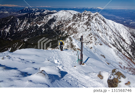 冬の八ヶ岳連峰・横岳稜線を行く登山者と赤岳
