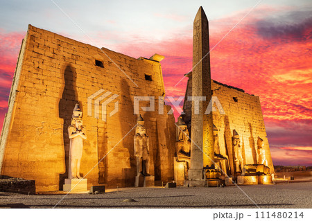 Luxor Temple entrance, first pylon with obelisk, sunset, Egypt