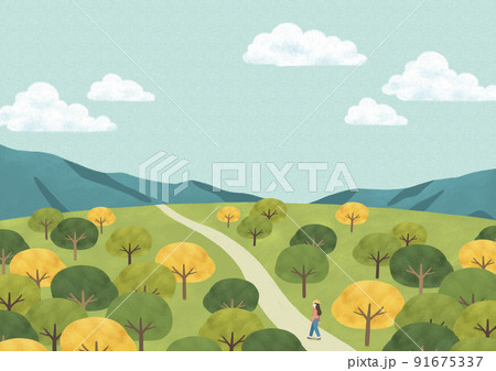 beautiful spring, summer, autumn scenery painting vector illustration of girl trekking, climbing mountain