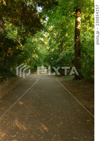 Avenue of plane trees in the city park on soft sunlight