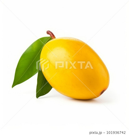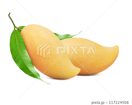Ripe Mango with green leaf isolated on white background. Clipping path.