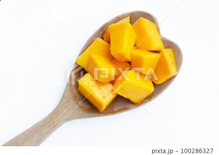 Ripe juicy yellow exotic mango cut into cubes on wooden background. Tropical delicacy full of