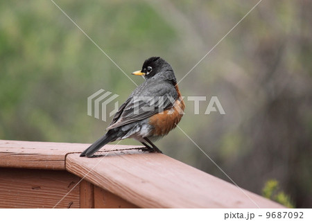 柵にとまるアメリカンロビンーAmerican robin on the fence