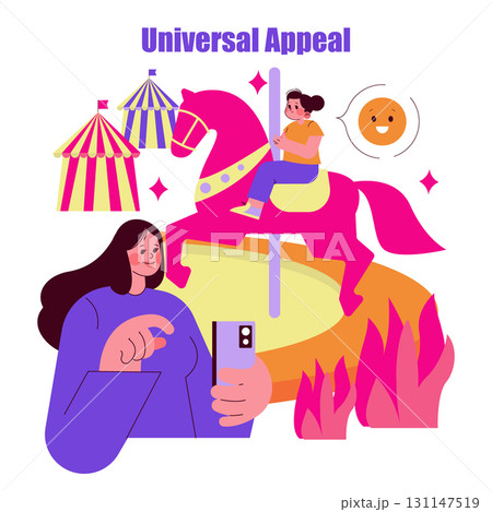 Vector illustration of a child riding a carousel horse while a person takes a photo. Colorful tents in the background create a festive atmosphere paired with smiling expressions.