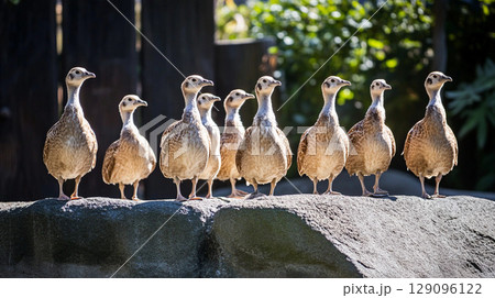 A group of ducks standing together on a rock at a zoo in Thailand, showcasing diverse plumage and natural behavior