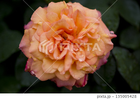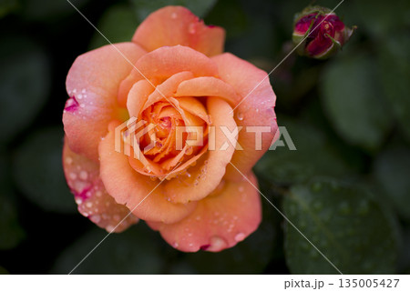 薔薇園に雨に濡れたバラの花が咲いています。このバラの名前はスブニール・ド・アンネ・フランクです。