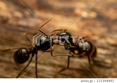 仲間の頭部を運ぶムネアカオオアリの兵アリ