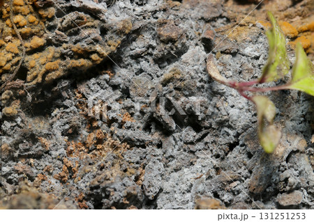 倒木が腐って、灰色や黄色いカビや菌類が樹皮表面を覆い生分解していく様子(自然環境下菌界マクロ撮影)