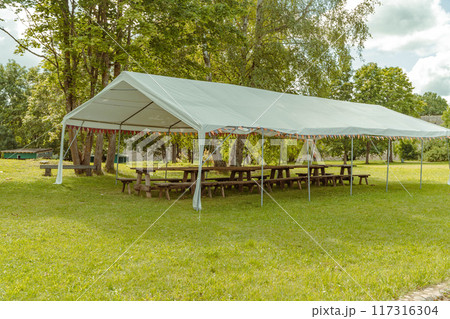 A spacious tent with benches stands ready for an outdoor event