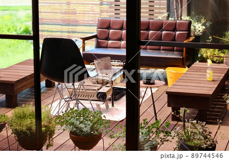 家のウッドデッキでバーベキュー、準備