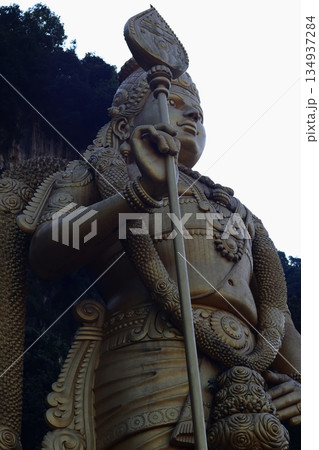 Close-up of a large Hindu deity statue at Batu Caves, Malaysia, emphasizing religious symbolism, stone texture, and cultural heritage.