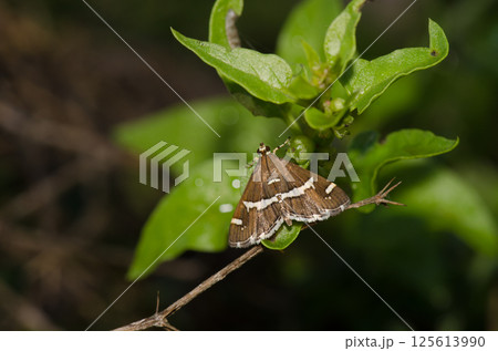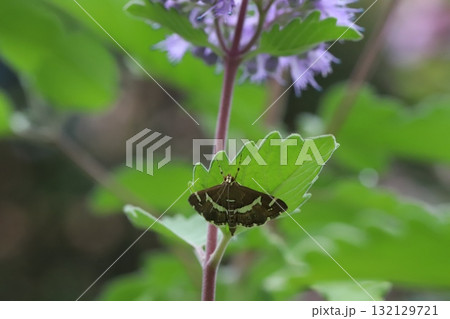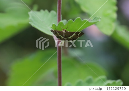 秋の庭に咲くダンギクの緑色の葉に止まるシロオビノメイガ(白帯野螟蛾)