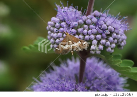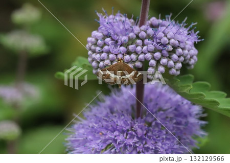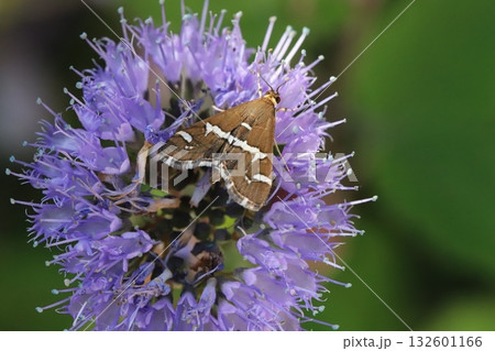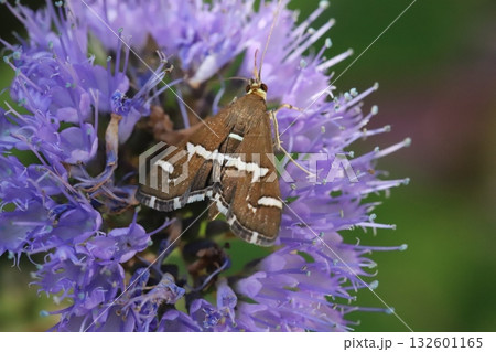 秋の庭に咲く紫色のダンギクの花に止まるシロオビノメイガ(白帯野螟蛾)