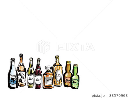 余白のあるアルコールドリンクボトルの手描きイラストセット