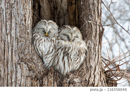 動物園の風景 シロフクロウのコンビ 北海道旭川市