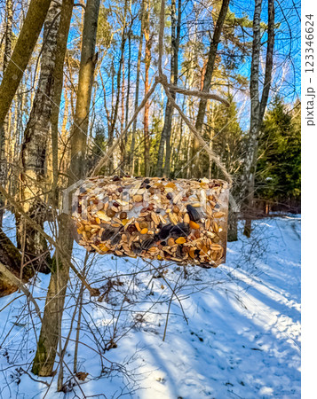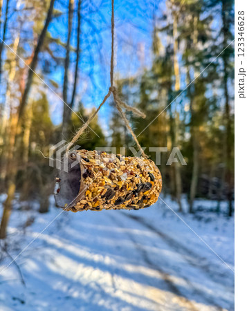 Hanging bird feeder made of seeds in a snowy winter forest with blue sky. High quality photo