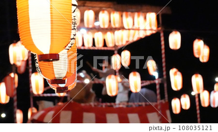The stage of the Yaguro. Paper red-white lanterns Chochin Scenery for the holiday Obon when people