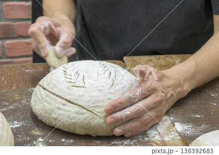 バヌトン(発酵カゴ)から出したカンパーニュ生地にクープを入れるパン職人の手元