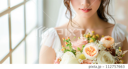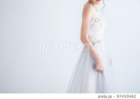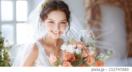 ウェディングドレスを着た笑顔が可愛い若い女性