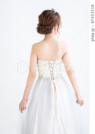 背中の開いた美しい白いドレスを着た女性の横顔 エステや脱毛、痩身