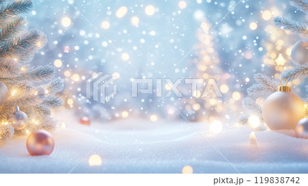 雪の中にクリスマスツリーが煌めくクリスマスの背景