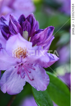 beautiful lilac rhododendron buds blossoming in garden. macro shot. art shot with selective focus and blurs