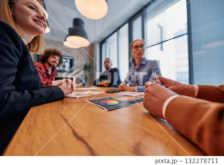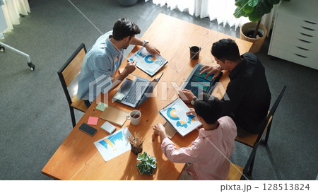 Top view of diverse business team talking and brainstorming idea. Convocation.