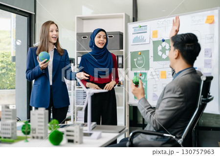 Business people having consultation about wind energy at company office. Business team discussing about windmill and alternative green enery. Net zero and carbon neutral