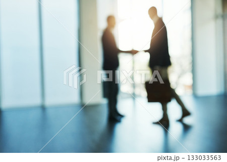 Handshake, silhouette and blur of business people in office for partnership, collaboration and agreement. Corporate, recruitment and and blurred men shaking hands for thank you, welcome and deal
