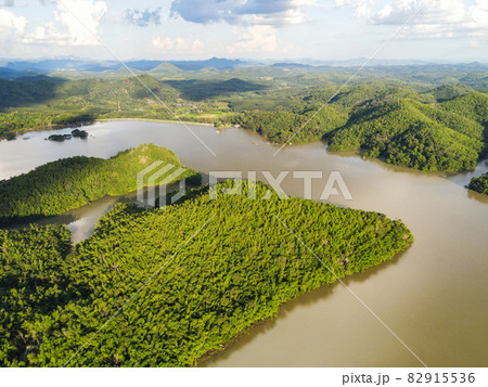 Reservoir, Aerial view river forest nature woodland area green tree, Top view river lagoon pond water from above, island green forest beautiful fresh environment landscape jungles lake