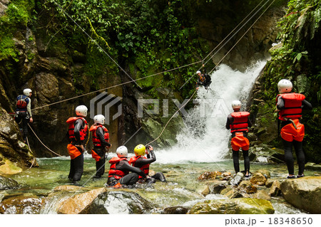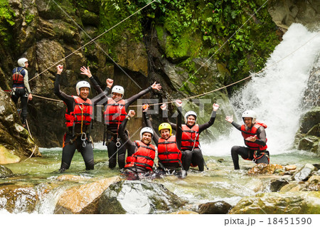 Team Of Mixed People On Canyoning Adventure