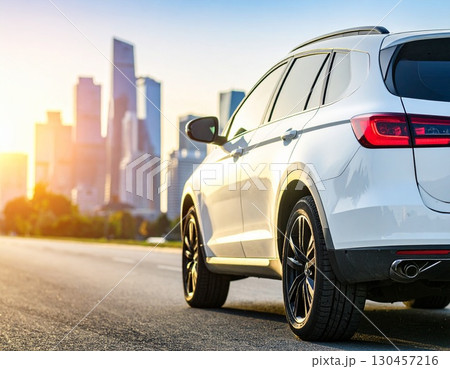 A car is driving down a highway with a sunset in the background