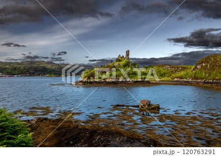 Ruin Of Castle Moil With Old Ship Wreck In The Harbor Of Village Kyleakin At The Atlantic Coast Of The Isle Of Skye In Scotland, UK