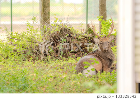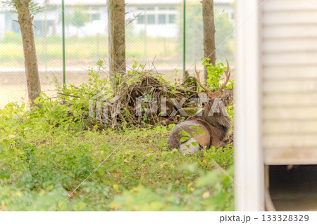 ニホンジカ 牡鹿が木陰でしゃがんで休んでいる