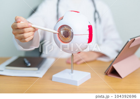 Doctor with human Eye anatomy model with magnifying glass. Eye disease, Refractive Errors, Age Related Macular Degeneration, Cataract, Diabetic Retinopathy, Glaucoma, Amblyopia, Strabismus and Health