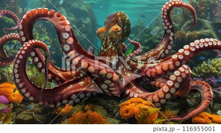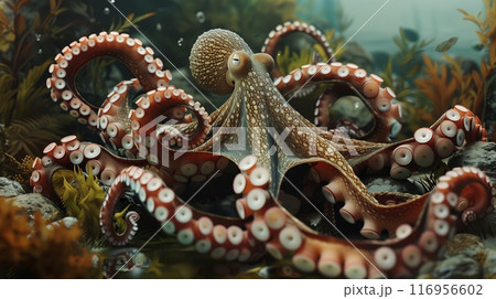 Magnificent octopus among the underwater picturesque landscape with marine life
