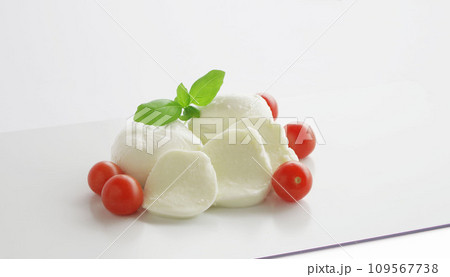白い背景にモッツァレラチーズ 赤いトマト グリーンのバジル